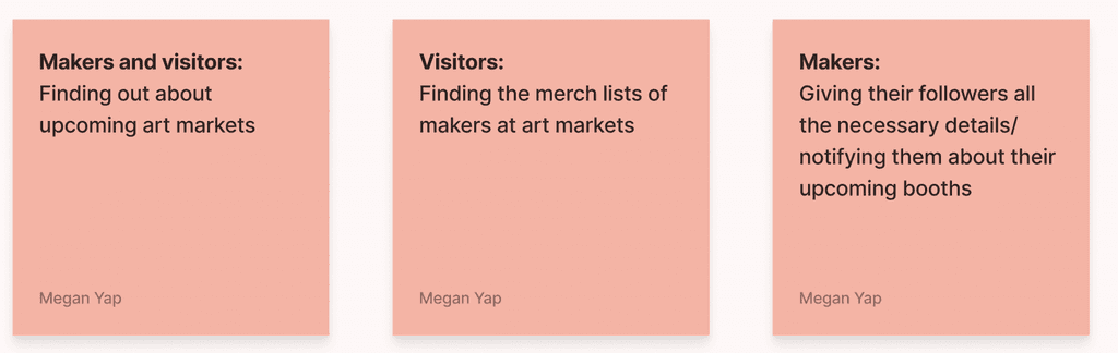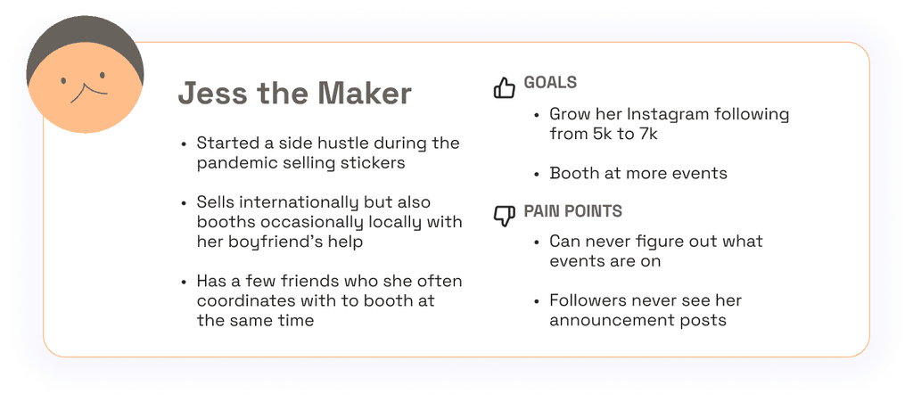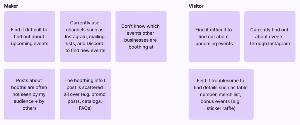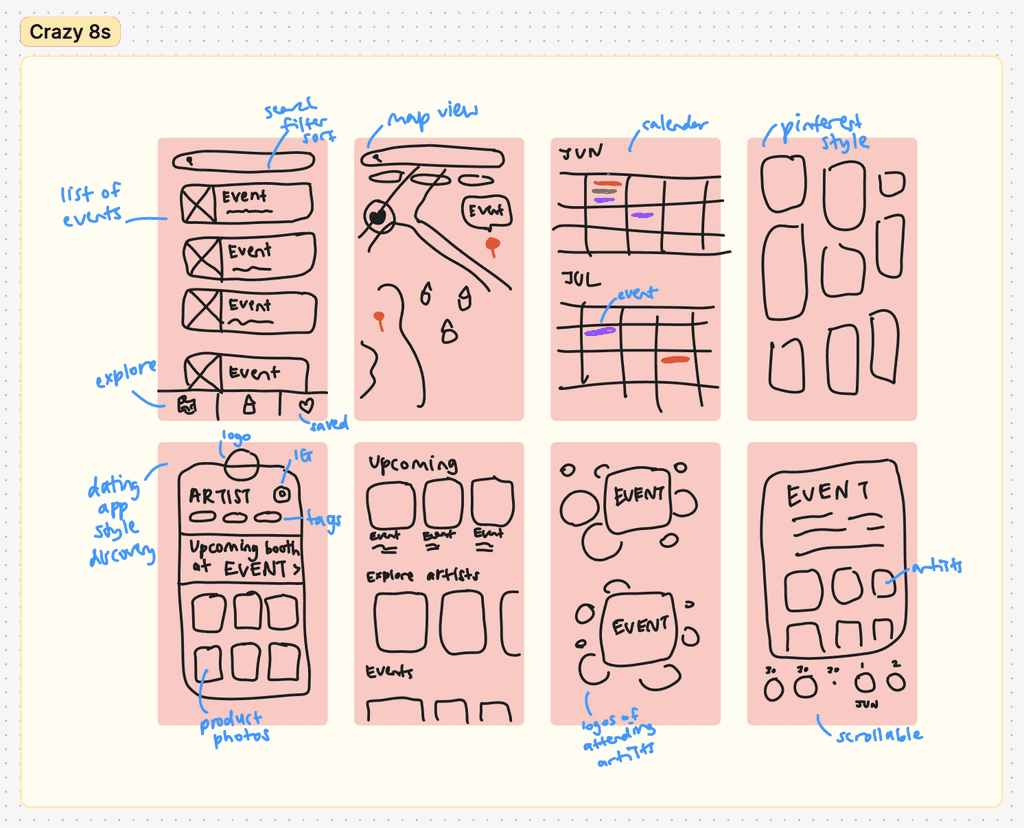 In ideating for this product, I went all-out with different ideas in the Crazy 8's exercise. I came up with a typical list style display of events, a map-based view of events, a Pinterest style board to scroll through, and even a dating app-inspired method of discovering new makers and their upcoming booths.