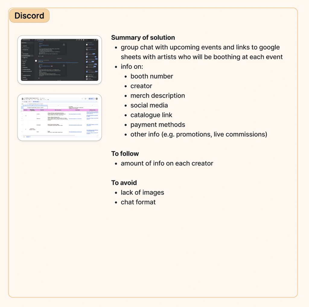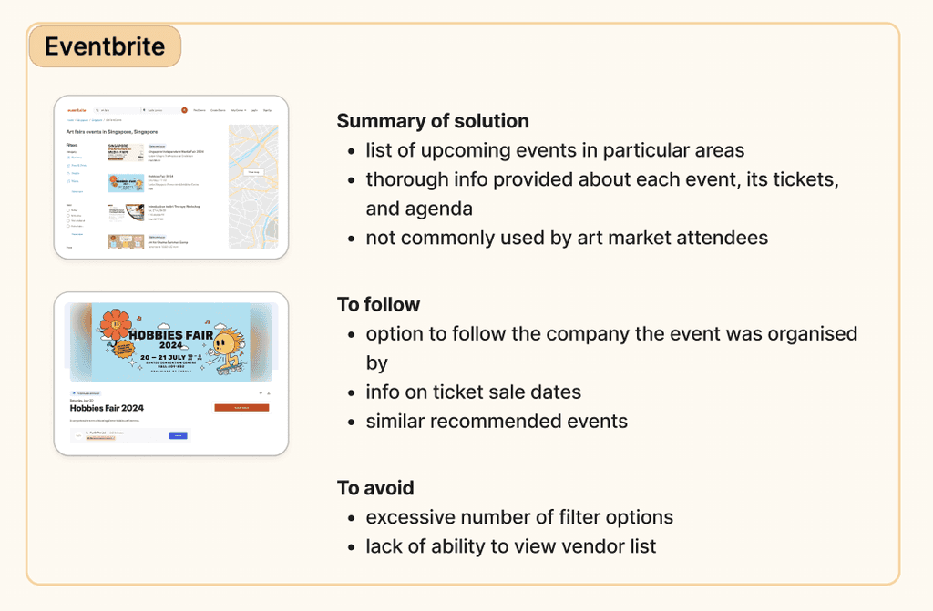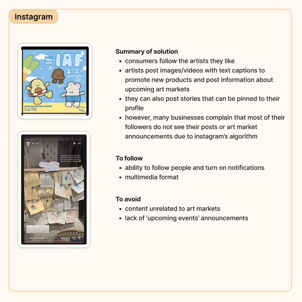 There is only one direct competitor to SG Booths: Eventbrite. Although Eventbrite is rarely used for makers' markets, I analyzed the product briefly, alongside indirect competitors Instagram and Discord which are used as communication channels to disseminate similar information.